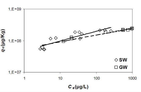圖1:活性炭吸附菲等溫線(qe:每單位質(zhì)量固體吸附的溶質(zhì)質(zhì)量,Ce:平衡溶質(zhì)濃度; FW:淡水; SW:鹽水)。
